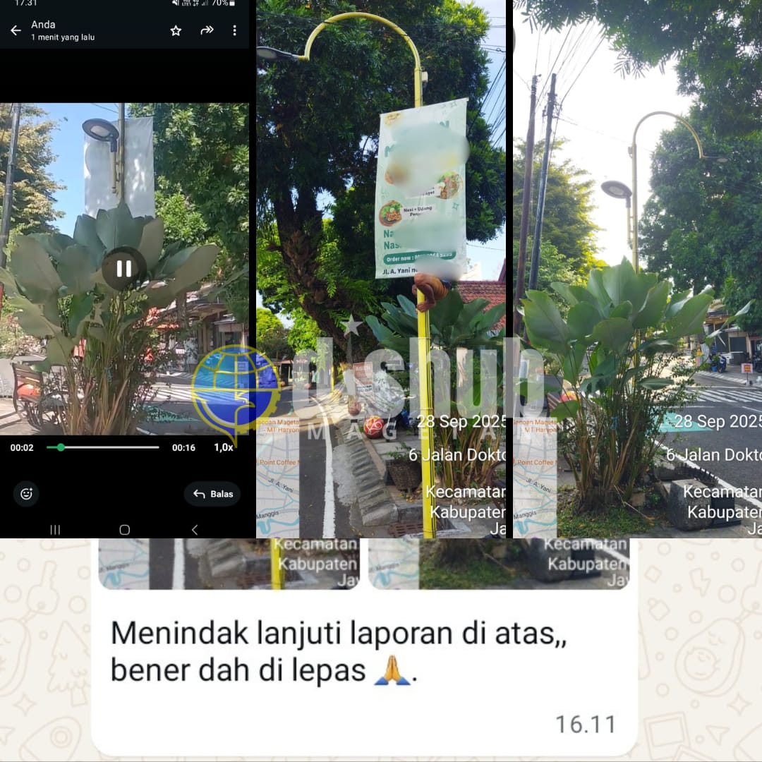 Magetan, 28 September 2025 — Sebuah banner iklan liar yang menutupi Penerangan Jalan Umum (PJU) di Jalan dr. Sutomo, tepatnya sebelum praktik dr. Wisnu, ditertibkan oleh Dinas Perhubungan Kabupaten Magetan…